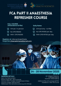 Link to register for the Wits FCA I Anaesthesia Refresher Course from 18-22 November 2024. Hybrid course with limited in person spaces to be hosted at the GE Innovation Centre in Melrose Estate.